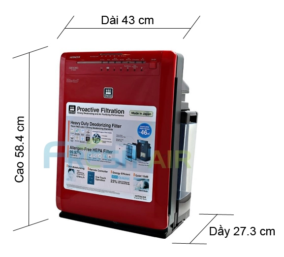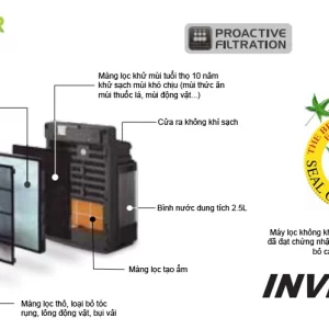 – Diện tích lọc: 46 m²- Màng lọc: màng lọc thô, màng lọc khử mùi, màng lọc HEPA và màng tạo ẩm- Công nghệ inverter: có- Tính năng: làm sạch không khí, loại bỏ phấn hoa và các chất gây dị ứng, khử mùi cực mạnh, tạo ẩm và giữ ẩm da- Công suất: 4/14/22/60 W- Kích thước (Rộng x Cao x Sâu): 430 x 584 x 273 mm- Trọng lượng: 10 kg- Dung tích bình nước: 2,5 lit- Bảo hành: 12 tháng toàn quốc- Xuất xứ: Nhật Bản