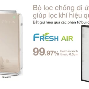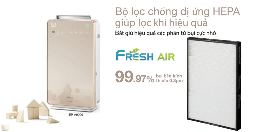 Bộ lọc bụi và chống dị ứng HEPA có hiệu suất bắt giữ các phân tử bụi có trong không khí cực kì hiệu quả, bộ lọc này còn có thể loại bỏ và ngăn chặn phấn hoa, nấm mốc, bụi bẩn có kích thước 0,3μm. Hiệu quả lọc đến 99,97% bụi giúp bầu không khí trong nhà luôn trong lành, sạch sẽ giúp bảo vệ sức khỏe cho các thành viên trong gia đình được tốt hơn. Máy lọc không khí Hitachi EP-A9000 trang bị bộ lọc HEPA có khả năng ngăn chặn các tác nhân gây di ứng hiệu quả như: phấn hương, bụi, phân nhện, gấu trên lông mèo,…